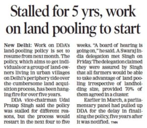 Changes in Land Pooling Policy for the simplification of the process have finally been accepted, in a meeting chaired by LG Anil Baijal on this Thursday (21st of Dec, 2017). The news was covered by various media houses. Please refer the news article below from Dainik Jagaran, on the same.